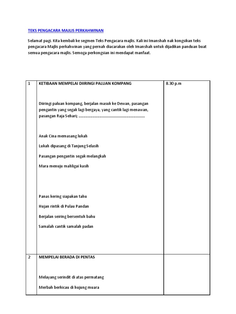 Teks Pengacara Majlis Perkahwinan By Ra_Lailah946 03 Sep, 2022 Post a Comment Teks Pengacara Majlis Perkahwinan Pdf Teks Mc Majlis Perkahwinan 2 Teks Pengacara Majlis Perkahwinan Skrip Pengacara Majlis Akad Nikah Teks Pengacara Majlis Perkahwinan Pdf Teks Pengacara Majlis Perkahwinan Share No comments for "Teks Pengacara Majlis Perkahwinan"